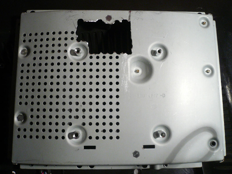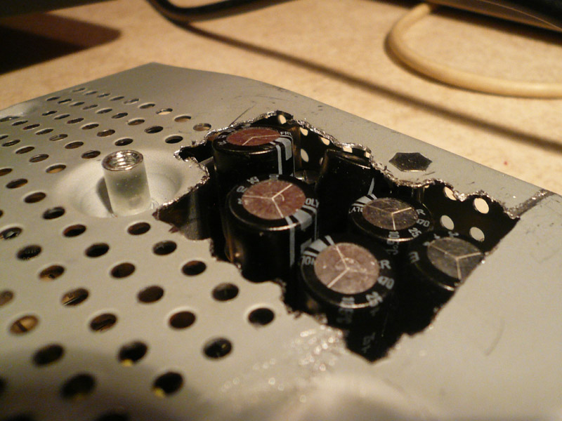 Les précédents étaient en rang d'oignon, pas une tête qui dépasse, et surtout pas une tête au-dessus du dissipateur thermique adjacent (le muret métallique qui borde sur deux côtés les condensateurs <-- ceci est une indication pour les nuls). Concrètement, cela veut dire que ce qui fermait avant, ne ferme plus maintenant. Deux solutions s'offrent à nous : la première est de racheter des condensateurs à la bonne taille, la deuxième est de faire du Sarkozy. En ces temps de crises, c'est bien évidemment la deuxième solution qui est retenu. On part donc du service public de fermeture suivant :