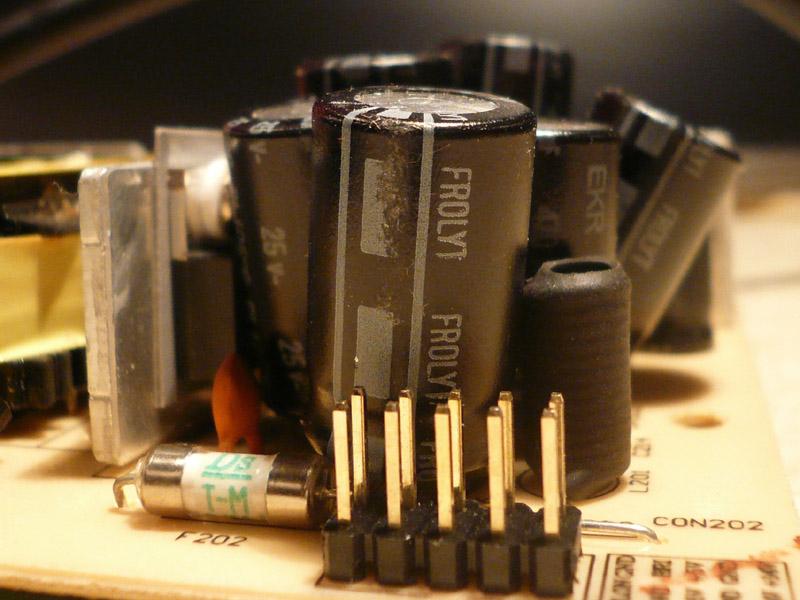 Notez que dans le cas normal, le condensateur est soudé sur un circuit imprimé ; s'il est déjà dans votre main, le problème est plus grave. N'ayant pas de testeur de condensateur pour cette capacité, décision est prise de tous les changer, pour des modèles "de qualité" (c'est la brochure qui le dit, moi ça fait 15 ans que je n'ai pas acheté un composant). Les condensateurs arrivent de Wervicq-Sud et ils ont une très bonne tête, mais je ne sais pas si c'est lié. Il y aurait eu une bière en bonus, le lien me serait paru plus évident, mais là, non. Et là l'oeil de lynx du Tanuki réagit : "mais ils ne seraient pas plus gros que les autres ?", "non non ma chérie, c'est standard c'est choses là". Bon. Effectivement. Tout n'est pas standardisé. En l'occurence, il a fallu y aller au chausse-pied :